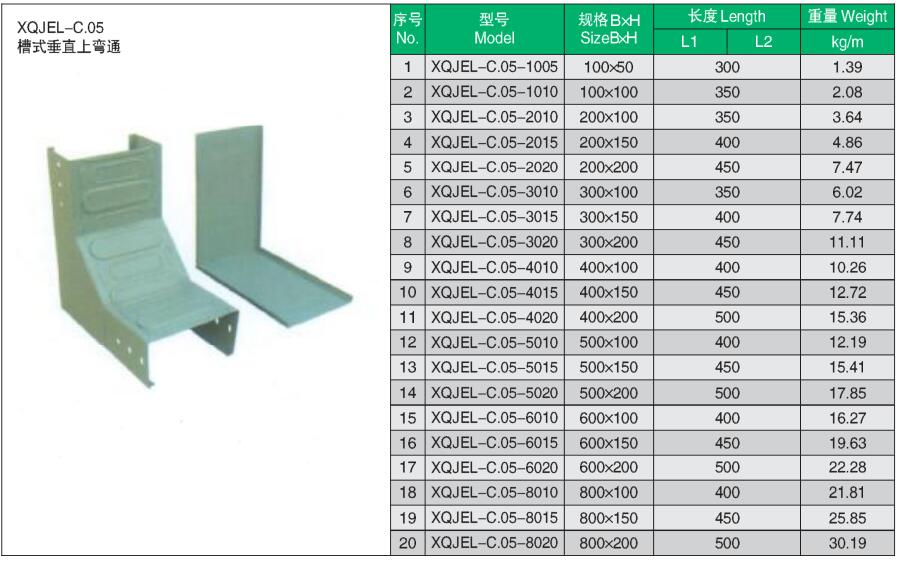 XQJEL_C.05槽式垂直上彎通產品型號、規格、重量等參數及XQJEL_C槽式電纜橋架在不同跨距下允許均布載荷變形量。