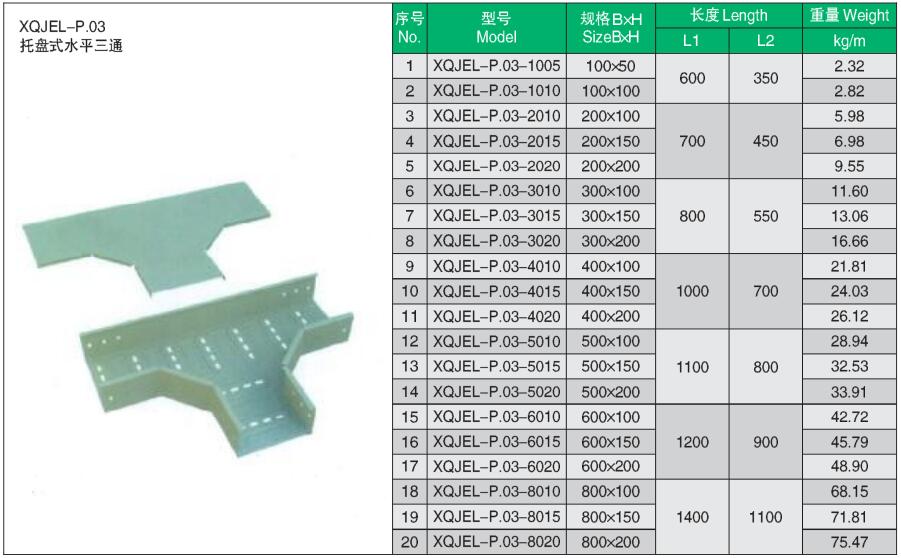 XQJEL_P.03托盤式三通產(chǎn)品型號、規(guī)格、重量等參數(shù)及XQJEL_P托盤式電纜橋架在不同跨距下允許均布載荷變形量。