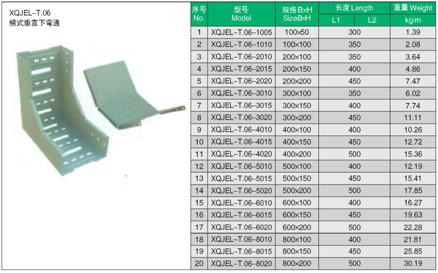 XQJEL_T.06梯式垂直下彎通產(chǎn)品型號、規(guī)格、重量等參數(shù)及XQJEL_T梯式電纜橋架在不同跨距下允許均布載荷變形量。