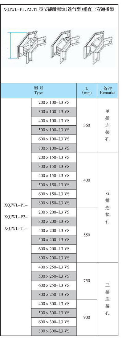 XQJWL-P1、P2、T1型節(jié)能耐腐蝕(透氣型)垂直上彎通橋架型號參數(shù):